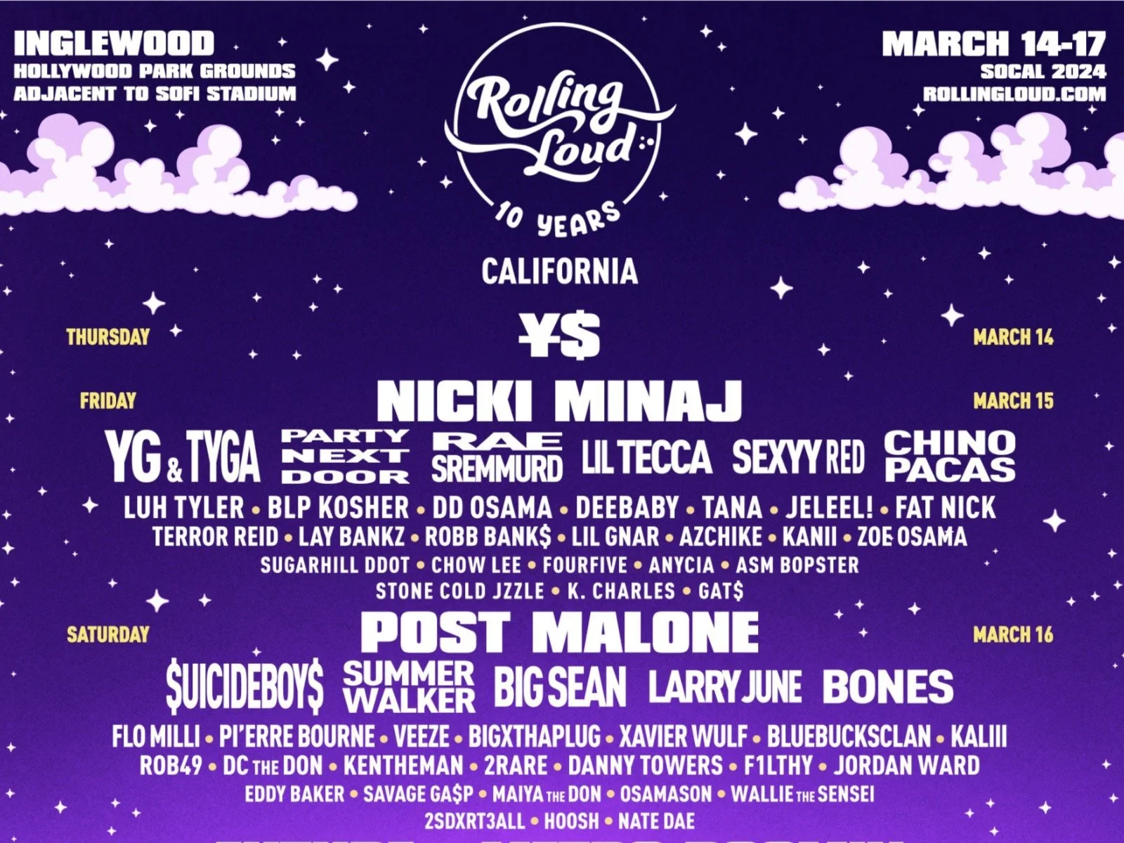 Headlined by ¥$ (Ye + Ty Dolla $ign), Nicki Minaj, Post Malone, and Future X Metro Boomin, who lead a lineup packed with many of the most notable names in modern rap music, Rolling Loud California returns to Hollywood Park, on the grounds adjacent to SoFi Stadium, in Inglewood, CAfrom March 14th-17th, 2024.